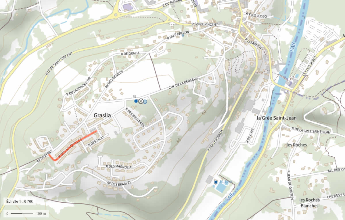 Accès: rue des Mimosas, rue des Bleuets, avenue des Pins