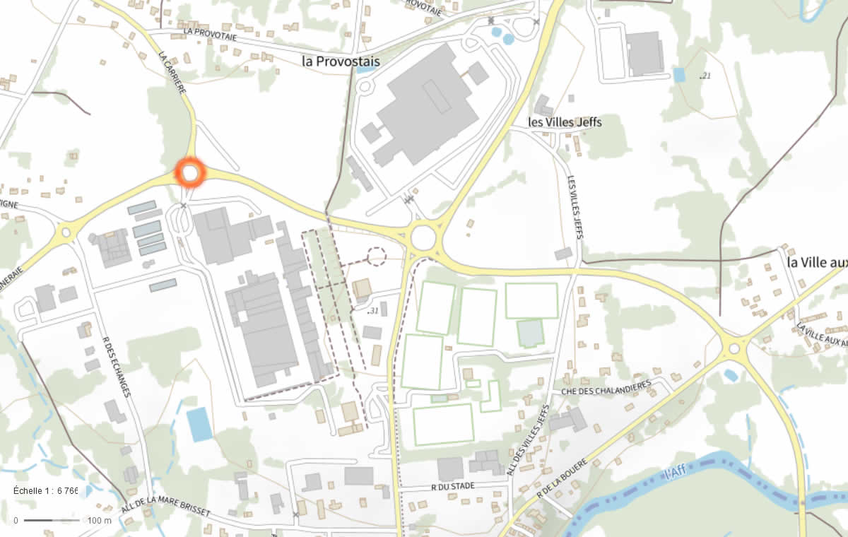 Le giratoire de la Provotaie est situé sur la départementale 773E, au nord du site ndustriel Yves Rocher la Croix des Archers.